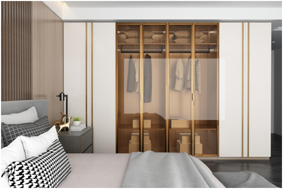 白色門板搭配金色通頂拉手,彰顯簡(jiǎn)潔大氣凸顯品質(zhì)感;再搭配上微金拉絲的茶色玻璃門,既能防塵又便于取衣搭配,輕奢風(fēng)油然而生。