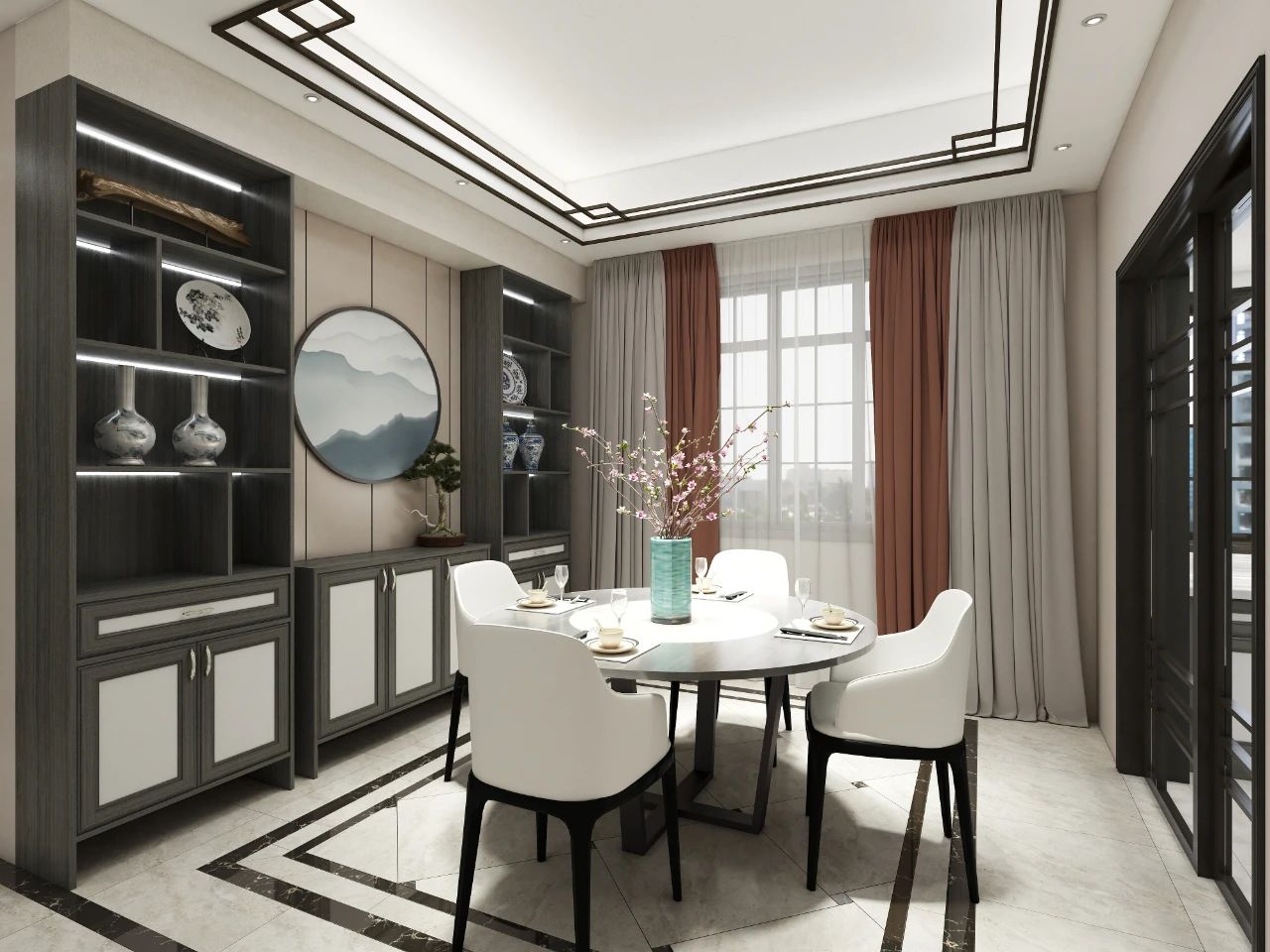 簡約式原木黑布紋電視柜、茶幾與新中式沙發(fā)座椅相得益彰,電視柜左右兩側(cè)各擺一裝飾花瓶,局部的小對稱充滿了“小心機(jī)”,讓空間更顯方正大氣。花瓶中一抹紅色的點(diǎn)綴,瞬間便讓空間頓時(shí)鮮活起來。