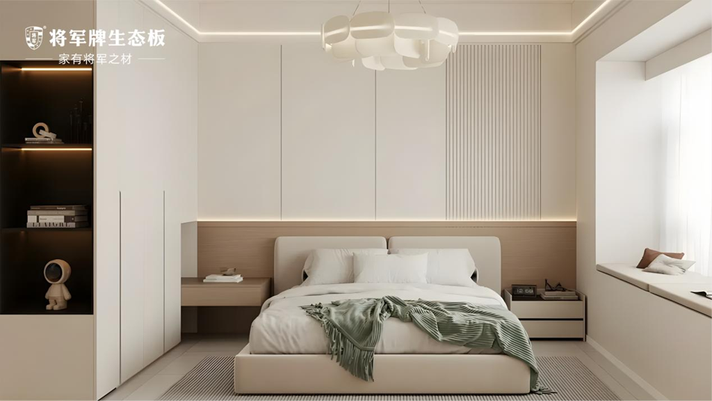 臥室是卸下一天疲憊、回歸自我的私密領域。在這里,無需繁復裝飾,材質的本質就是最好的語言。將軍牌生態(tài)板以純粹的原木色調,通過精準的切割和細膩的封邊工藝,打造出渾然天成的休憩空間。木材天然的溫潤觸感,紋理的自然流動,都在無聲中傳遞著寧靜與安詳。